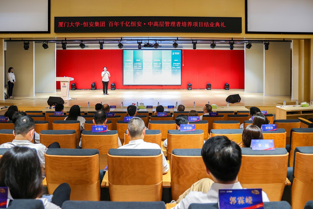 厦门大学管理学院EDP中心主任陈闯教授、恒安行政部总监刘莹分别代表双方出席结业典礼,和恒安中高层管理者共同为历时14个月的学习之旅画上一个圆满的句号。结业典礼由厦大管院EDP中心副主任吕雯主持。